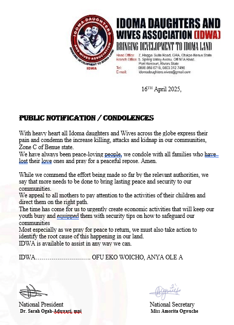 The Idoma Daughters and Wives Association (IDWA) expresses deep sorrow over the rising insecurity, killings, and kidnappings in Zone C of Benue State. As peace-loving people, we stand in solidarity with all families who have lost loved ones and offer our heartfelt condolences.